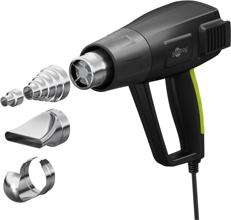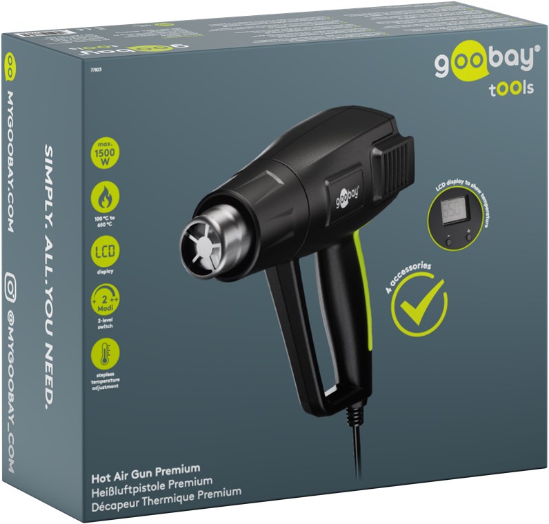Kvalitets-varmluftspistol på 1500W, med digitalt display. Medfølger 4 endestykker/dyser.