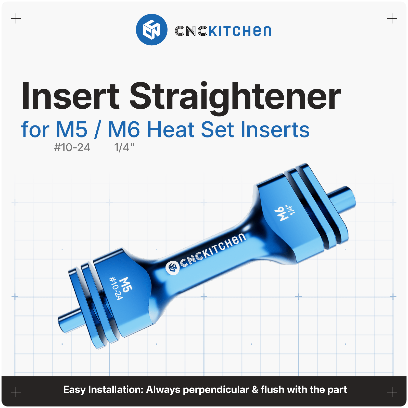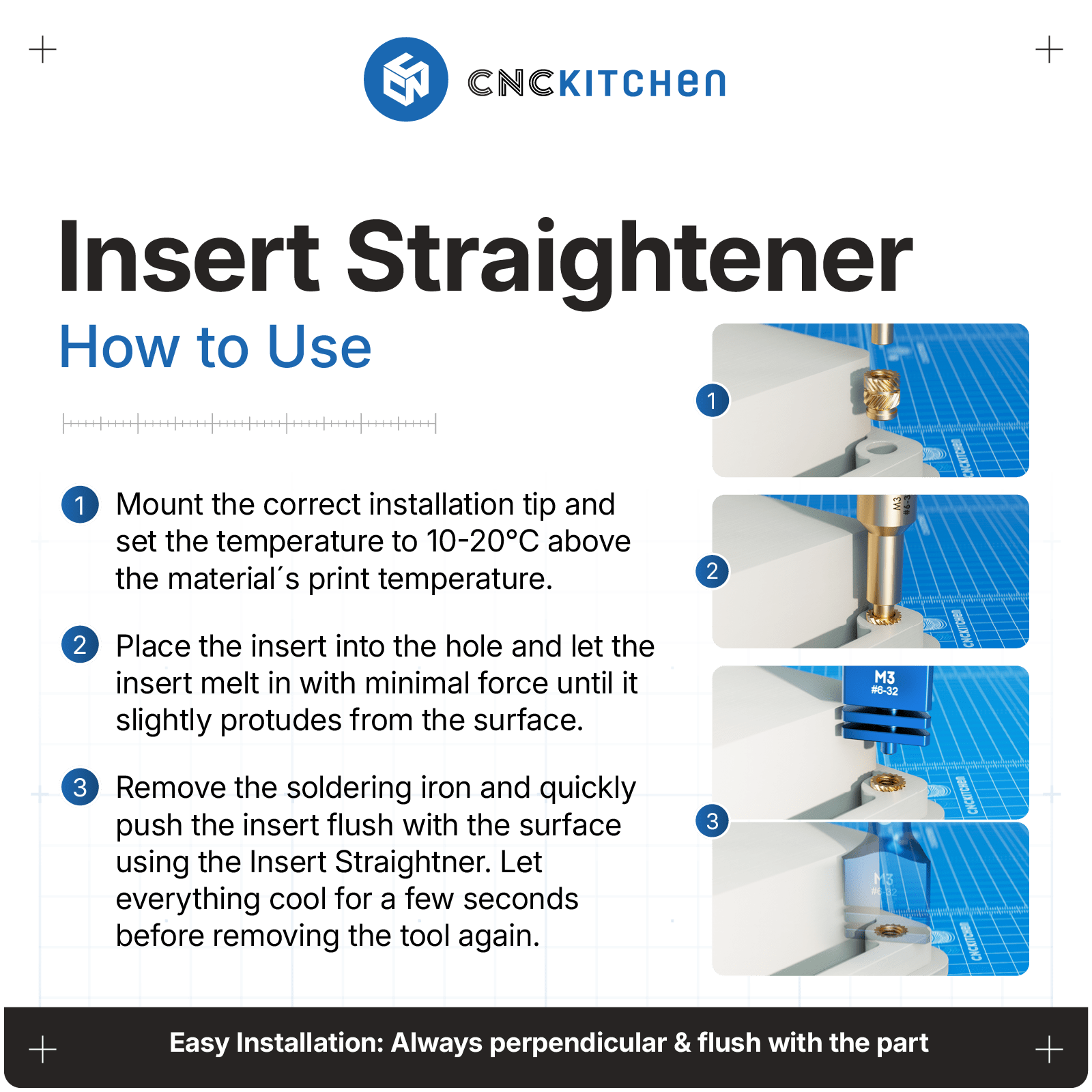 For flat/rett installasjon i forhold til overflaten. Brukes rett etter installasjon av gjengeinnsats for å «rette opp» innsatsen mens den fortsatt er varm.